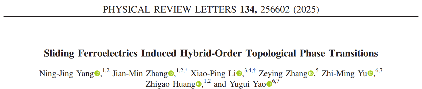 近日,我校物理科学与技术学院李小平研究员团队在铁电操控拓扑量子态方面取得重大突破,在物理学顶级期刊Physical Review Letters上发表题为“Sliding Ferroelectrics Induced Hybrid-Order Topological Phase Transitions”的研究成果。(论文链接:https://journals.aps.org/prl/pdf/10.1103/l1n5-1jsm)。李小平研究员为该论文的通讯作者,福建师范大学的张健敏教授为文章的共同通讯作者。 在当今科技飞速发展的时代,拓扑...