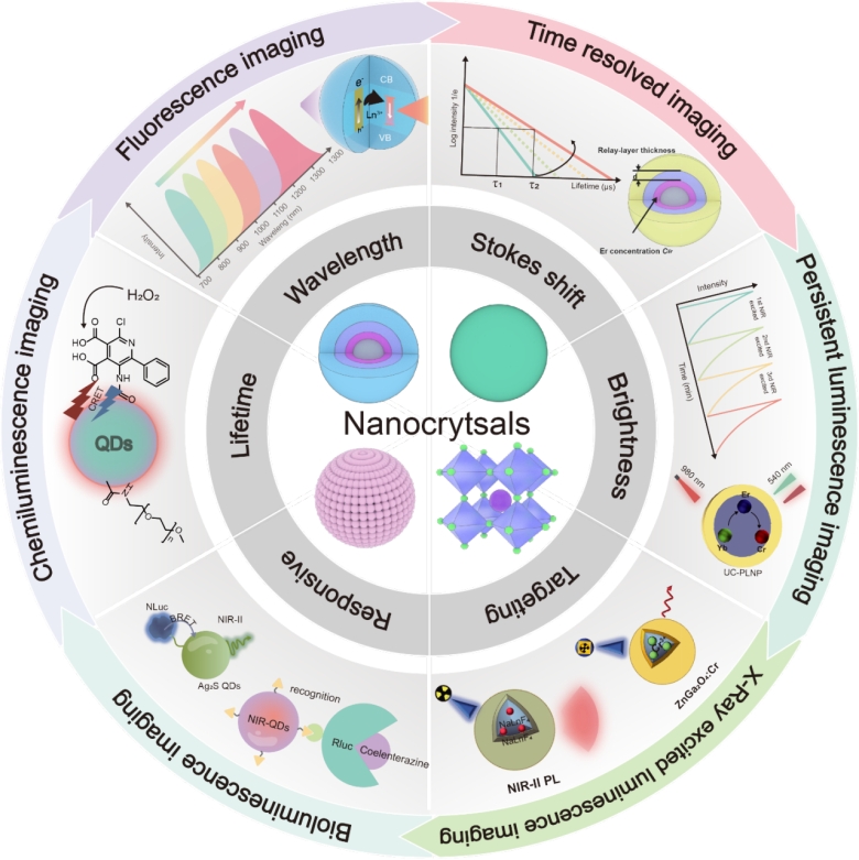 In recent years, in vivo luminescent imaging technologies have been developing and innovating, which is helpful to deeply understand the biological system. As the subcategory of the research of in vivo imaging, the research in NIR nanocrystal has greatly driven the development of in vivo luminescent imaging technologies. This review comprehensively sketches out, for the first time, NIR nanocrystal probes applied in different modalities for in vivo luminescence imaging and elaborates on how to achieve high-contrast imaging of deep-tissue by optimizing the photophysical properties of nanocrystals, such as wave length, brightness, Stokes shift, luminescence lifetime, targeting ability or activatable properties. The review provides a theoretical support for the research and development in the related fields and plays an important role of reference and guidance in the subsequent research of NIR in vivo luminescent imaging carried out by the scholars at home and abroad.