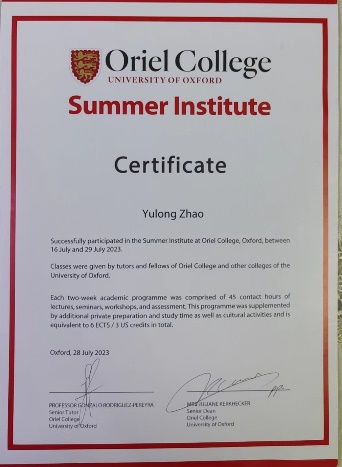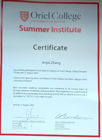 The courses the students of IMU chose were as follows: Five students chose Economics of Public Policy; 3 chose both Economics of Public Policy and Knowledge and Reality and 1 student chose Introduction of Finance. Strengthening the communication and exchange with professors and classmates, the students overcame the fear in language communication, strove to learn and adapted themselves to their life at Oxford University. Finally, they successfully got the certificates for the courses. The credits of Oxford University are equal to 1.5 ECTS/3 US credits. And the credits the students got at Oxford will be transferred at IMU according to The Method to Accredit Credits Undergraduate Students of SEM Get in Their Overseas Studies at Oxford University in Summer Holiday.