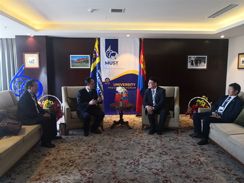 A delegation (right) from Inner Mongolia University   talks with Baatar Ochirbat (2nd, left), president of the Mongolian University of Science and Technology,  while attending the 60th anniversary of the founding of MUST. [Photo provided to imu.edu.cn/yw]