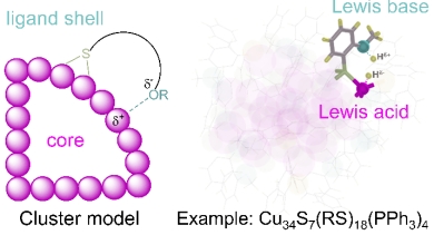 在此项研究中,团队巧妙地使用含有2-甲氧基的硫醇配体修饰铜纳米团簇表面。在这个团簇中,硫醇配体与其它有机配体一起用于稳定金属内核,而极为独特的是,团簇表面部分的甲氧基(LB)竟与表面铜原子(LA)配位形成FLP。理论计算表明,正是纳米团簇表面的FLP活性位点通过异裂途径活化H2,进而才实现温和条件下的高效催化加氢(见图)。在本工作中,作者利用[Cu34S7(RS)18(PPh3)4]2+纳米团簇作为模型催化剂(以下简称为Cu34,RSH = 2-甲氧基苯硫醇),初步探究了FLPCluster在小分子活化中的实际应用。