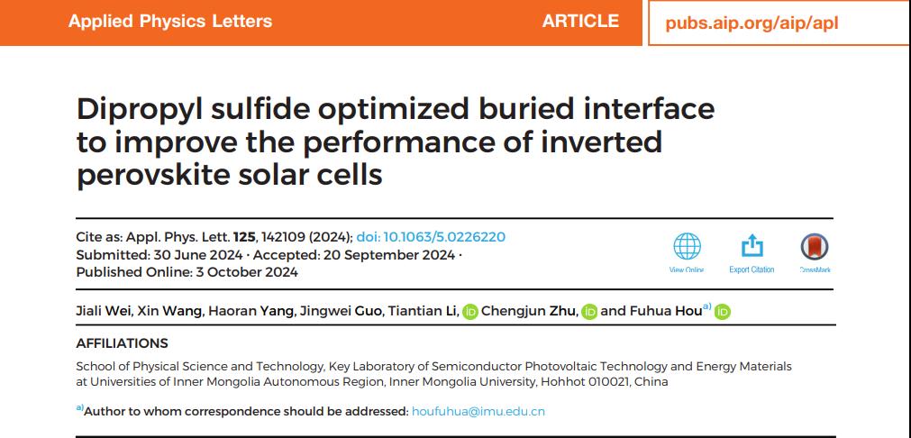 近日,我校物理科学与技术学院侯福华研究员课题组在基于氧化镍的倒置钙钛矿太阳电池的埋底界面调控方面取得了最新进展。研究成果以“Dipropyl sulfide optimized buried interface to improve the performance of inverted perovskite solar cells”为题,发表于学科卓越期刊《Applied Physics Letters》(nature指数收录)上,论文链接:https://doi.org/10.1063/5.0226220。