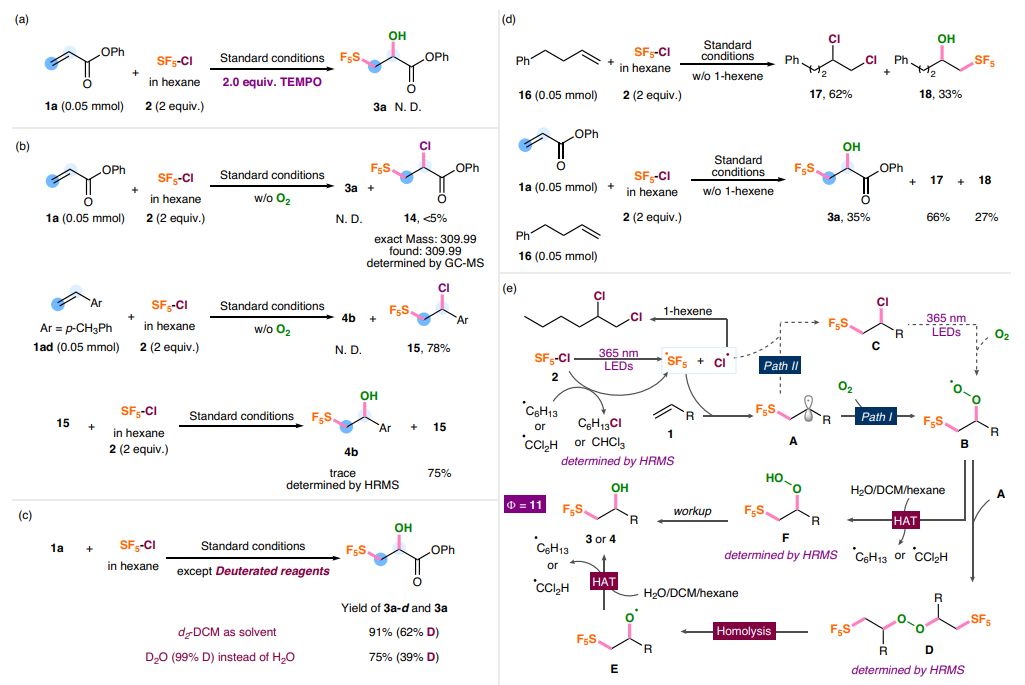 作者进行了相关的衍生化反应,获得了α-SF5酮、SF5二醇、SF5环酯等衍生物,并且通过机理验证实验探究了反应过程可能的机理。