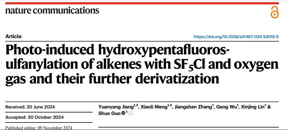 近日,化学化工学院郭硕课题组基于前期研究基础,合成了一种新型的含氟醇——五氟硫基醇。相对于应用较为成熟的六氟异丙醇、三氟甲基醇等,作者通过光诱导完成了烯烃同时引入羟基以及五氟硫基两种官能团,得到相应的五氟硫基醇类化合物。该策略采用光诱导SF5Cl形成SF5自由基,使用氧气作为羟基源,绿色经济的条件下,克服了传统的自由基反应不可控的问题,同时抑制了氯自由基与烯烃的直接加成,一步法实现了烯烃的羟基五氟硫基化反应,获得一系列五氟硫基醇。这些五氟硫基醇还可以作为合成α-SF5酮、SF5二醇、SF5环酯的前体,为药物分子、新材料分子等的研发提供了新的策略。相关工作近期以为“Photo-induced hydroxypentafluorosulfanylation of alkenes with SF5Cl and oxygen gas and their further derivatization”为题发表在国际著名化学期刊Nature Communications上(论文链接:https://www.nature.com/articles/s41467-024-54015-5)。k8凯发博士生姜远洋和硕士生蒙笑莉为本文共同第一作者,k8凯发郭硕研究员为独立通讯作者,k8凯发为独立完成单位。