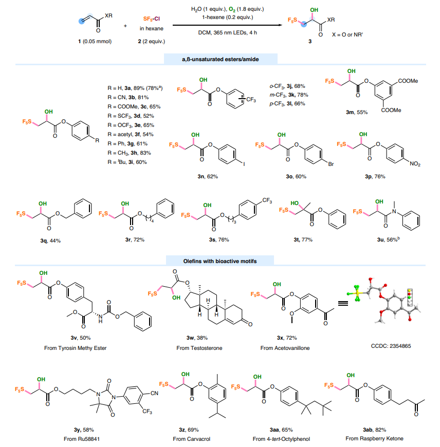 综上,作者发现了一种高效实用的烯烃羟基五氟硫基化方法,该方法适用于各种单取代和二取代烯烃,具有广泛的底物范围和官能团耐受性。此外,五氟硫基醇的相关衍生化反应可以为构建含有SF5基团的复杂分子提供新的途径。