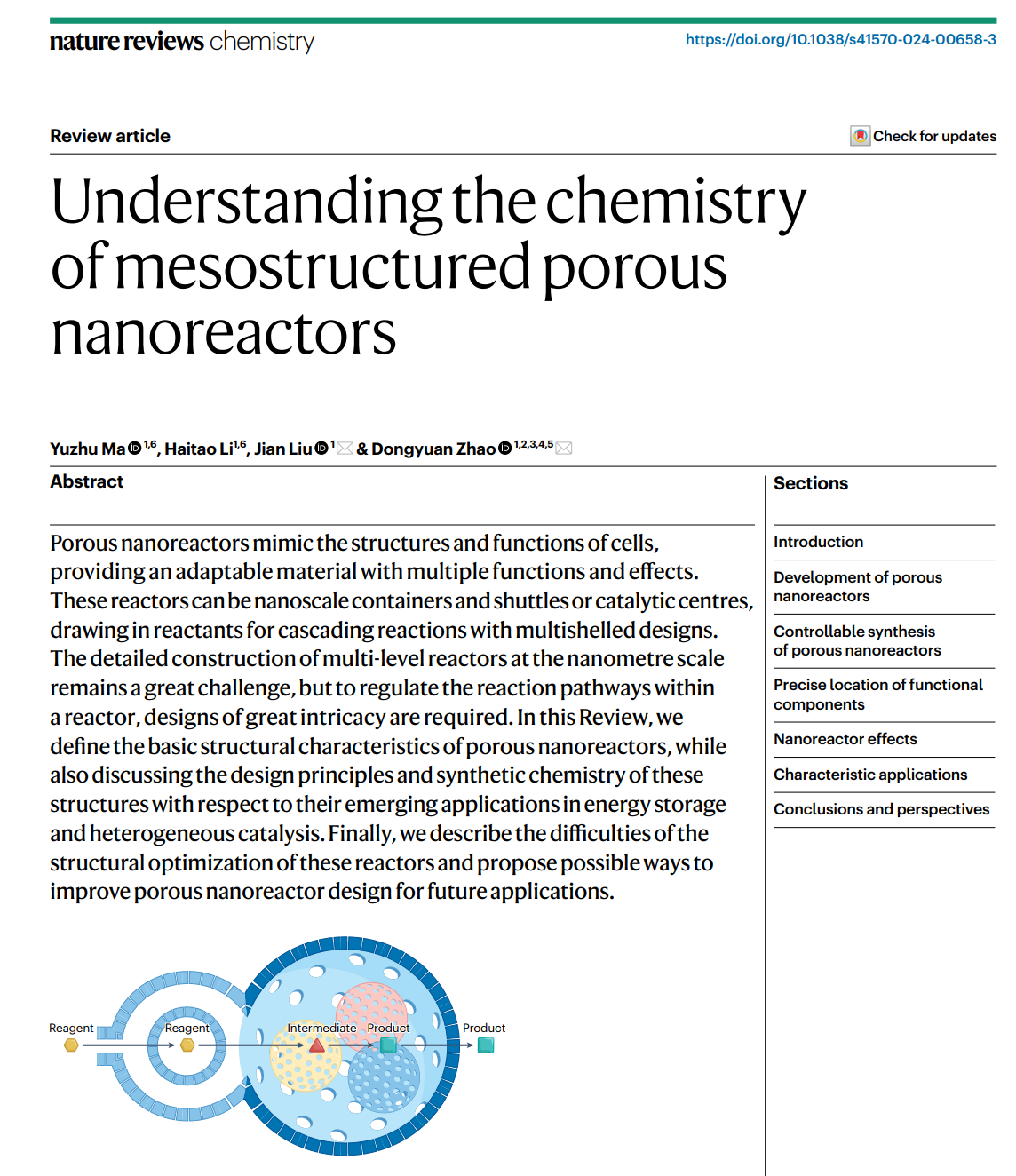 近日,我校能源材料化学研究院赵东元院士、马玉柱研究员联合化学化工学院刘健教授在Nature Reviews Chemistry(化学领域顶级综述期刊,影响因子42.1)上发表了题为“Understanding the chemistry of mesostructured porous nanoreactors”的研究论文。该论文系统介绍了介观结构的多孔纳米反应器的设计与合成,纳米反应器效应的影响,并深入探讨了其在储能、催化和生物医学领域的应用潜力。