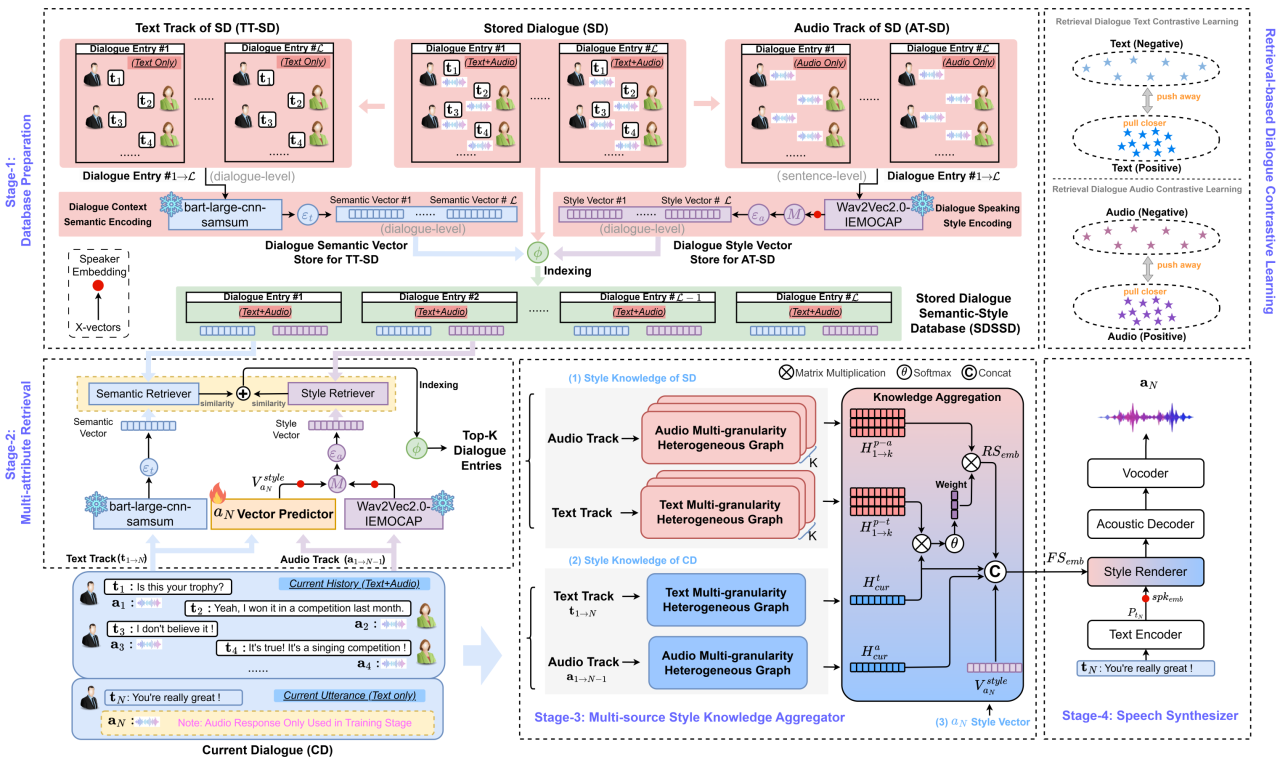 对话语音合成(Conversational Speech Synthesis,CSS)旨在以当前对话历史为参考,合成符合会话风格的表现力语音。与当前对话不同,存储的对话包含了用户与智能体在早期交互阶段中保留的对话片段,这些片段包含了与当前对话类似场景相关的风格表达知识。需要注意的是,这些知识对于帮助智能体合成能够产生共情反馈的表现力会话语音具有重要意义。然而,现有的研究普遍忽略了这一点。为了解决这一问题,我们提出了一种用于表现力CSS的新型检索增强对话知识聚合方案,称为RADKA-CSS。该方案包括三个主要组件:1)为了从存储对话中有效检索在语义和风格上与当前相似的对话,我们首先构建了一个包含文本和音频样本的存储对话语义-风格数据库(Stored Dialogue Semantic-Style Database,SDSSD)。然后,我们设计了一种多属性检索方案,将当前的对话语义和风格向量与SDSSD中存储的对话语义和风格向量进行匹配,从而检索出最相似的对话。2)为了有效利用当前对话和检索到的对话中的风格知识,我们提出多粒度异构图结构对对话进行编码,并引入多源风格知识聚合机制。3)最后,将聚合后的风格知识输入语音合成器,帮助智能体合成符合会话风格的表现力语音。我们基于CSS任务的基准数据集DailyTalk开展了全面深入的实验。客观评估和主观评估结果均表明,RADKA-CSS在表现力呈现方面优于现有的基线模型。相关代码和音频样本可访问以下链接获取:https://github.com/Coder-jzq/RADKA-CSS 。