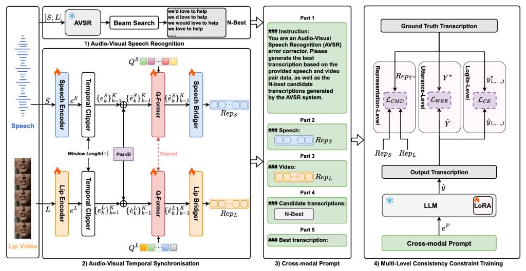 与传统的自动语音识别(ASR)不同,视听语音识别(AVSR)同时采用音频和视觉信号来推断转录。最近的研究表明,大语言模型(LLMs)可以从 ASR 生成的 N-Best 假设中预测出最佳转录,从而有效地用于 ASR 的生成性纠错(GER)。然而,这些 LLMs缺乏同时理解音频和视频的能力,使得 GER 方法在 AVSR 中的应用面临挑战。在这项工作中,我们提出了一种用于 AVSR 的新型 GER 范式,称为 AVGER,它遵循 “Listening and Seeing Again”的概念。具体来说,我们首先利用强大的 AVSR 系统读取音频和视觉信号,得到 N-Best 假设,然后利用基于 Q-Former 的多模态同步编码器再次读取音频和视觉信息,并将其分别转换为 LLM 可以理解的音频和视频压缩表征。之后,音视频压缩表征和 N-Best 假设共同构成跨模态提示,引导 LLM 生成最佳转录。此外,我们还提出了多级一致性约束训练准则,包括对数级、语篇级和表征级,在提高校正精度的同时,增强了音视频压缩表征的可解释性。在 LRS3 数据集上的实验结果表明,我们的方法能够在较短的时间内对语音进行校正。在 LRS3 数据集上的实验结果表明,我们的方法优于目前主流的 AVSR 系统。与它们相比,所提出的 AVGER 可以将字错误率(WER)降低了27.59%。