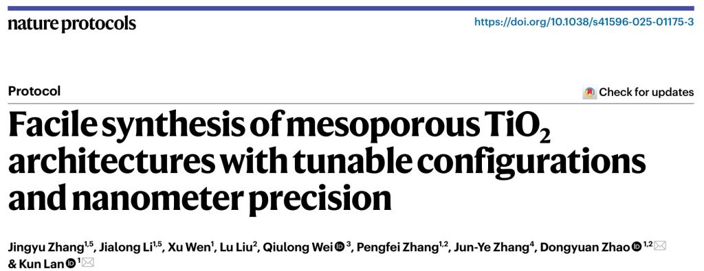 近日,我校能源材料化学研究院赵东元院士团队兰坤课题组以第一单位在国际期刊Nature Protocols和Nano Letters发表最新研究成果,进一步为拓宽介孔二氧化钛基材料的可控合成及高性能应用提供案例支持。工作得到了国家重点研发计划课题、国家自然科学基金青年、面上项目、k8凯发“骏马计划”、内蒙古杰出青年基金、内蒙古草原英才及内蒙古青年科技人才发展项目的大力支持。