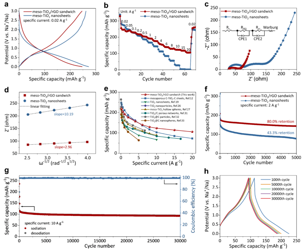 该团队提出一种次序单胶束组装法,设计了一种介孔TiO?/还原氧化石墨烯三明治结构,它由中间的rGO层和两侧的超薄介孔TiO?单层组成。该结构的成功合成依赖于中间体三嵌段共聚物F127/TiO?单胶束来平衡前驱体钛酸四丁酯(TBOT)水解和胶束预组装。其中,二维介孔结构提供了高的电解质可及表面积和缩短的钠离子扩散途径,内部rGO形成平面导电网络以增强电荷传输。这种三明治结构作为SIBs负极,在0.02Ag??下表现出247mAhg??的可逆容量,20Ag??下106mAhg??的优异倍率性能和超强循环稳定性(2Ag??下循环5000次和10Ag??下循环30000次)证明该材料在SIBs领域应用的潜力。该工作为开发集成介孔TiO?复合材料提供了一个优秀示例,对未来储能领域的发展具有指导意义。