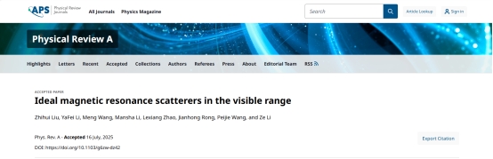 近日,我校物理科学与技术学院青年教师李泽博士带领的原子分子光物理团队在磁光领域取得进展——首次揭示不对称双硅球颗粒在特定条件下可实现完美的磁光散射现象。相关研究成果以 “Ideal Magnetic Resonance Scatterers in the Visible Range” 为题,以快报(Letter)形式被原子分子光物理领域(AMO)国际著名期刊《Physical Review A》(该刊为 Nature 指数收录的学科卓越期刊)录用。